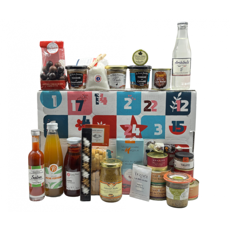 Le Calendrier L’Avent Gourmand Sans Alcool – 24 cases est une sélection raffinée de produits artisanaux pour les fêtes. Chaque case offre une surprise sucrée ou salée : flan de cèpes, rillettes de truite et de canard, pâtés, canelés, sucettes au caramel beurre salé, sarments du Médoc et pur jus de fruits.