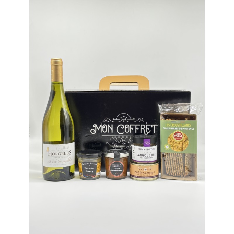 Un apéritif complet et raffiné avec ce coffret gourmand réunissant produits du terroir et saveurs marines. À partager entre amis ou à offrir pour faire plaisir.