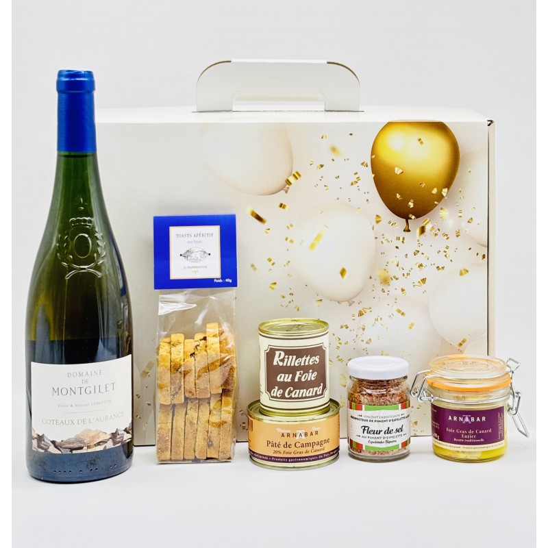 Un coffret raffiné réunissant foie gras, rillettes, pâté et vin moelleux, pour une expérience gastronomique d’exception.