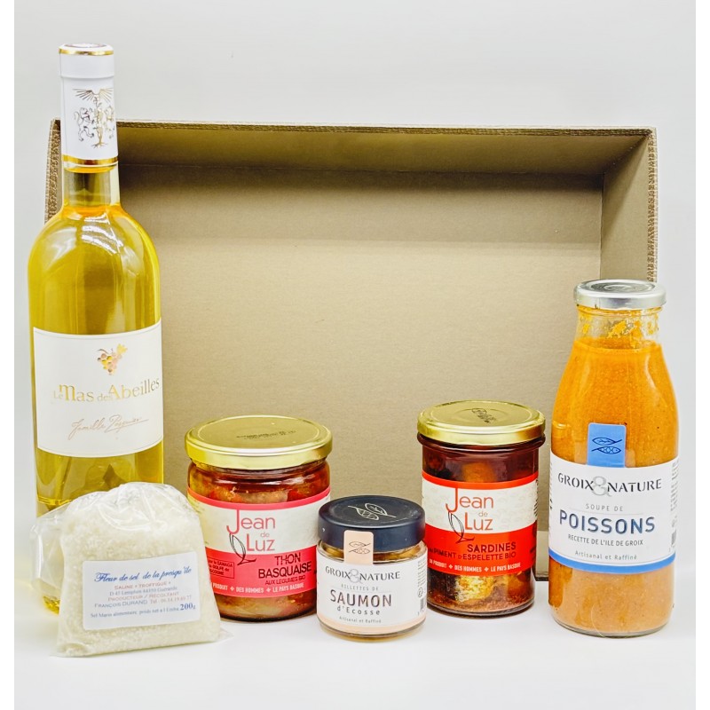 Coffret Retour de Pêche avec spécialités de la mer et vin blanc. Idéal pour offrir ou savourer un moment iodé et gourmand.