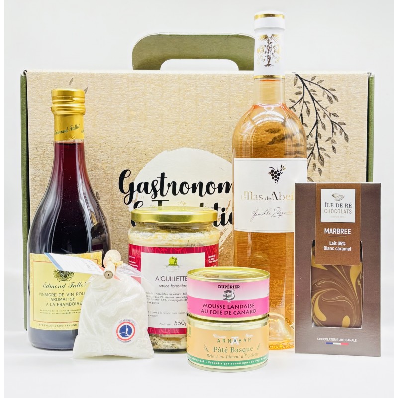 La Panière Paris est un coffret qui met à l’honneur le meilleur de la gastronomie française. Il combine des produits artisanaux et raffinés : le pâté basque au piment d’Espelette et la mousse Landaise au foie de canard pour les saveurs salées, le vinaigre de vin rouge au jus de framboise et les aiguillettes sauces forestière pour la touche terroir, ainsi qu’une tablette de chocolat au lait marbrée blanc et caramel pour le plaisir sucré. Le coffret comprend également le Le Mas des Abeilles rosé, vin élégant qui accompagne parfaitement l’ensemble.
