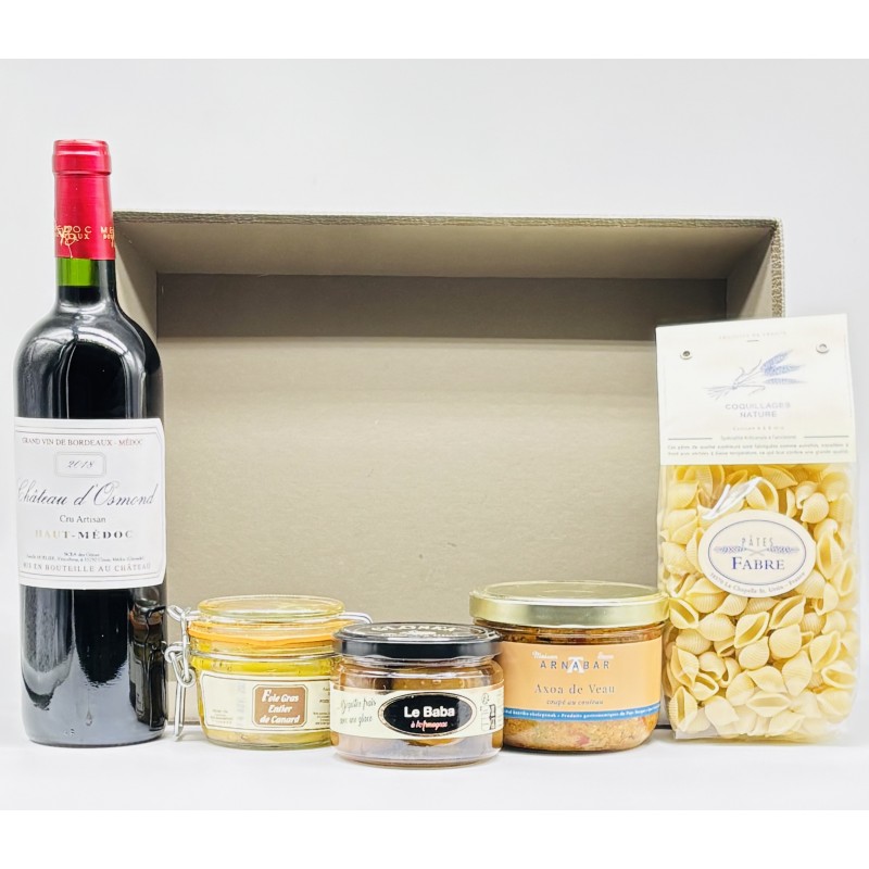 Coffret gastronomique du Sud-Ouest, foie gras entier, axoa de veau, coquillages, vin Château d’Osmond, Baba à l’Armagnac, cadeau gourmand, repas raffiné