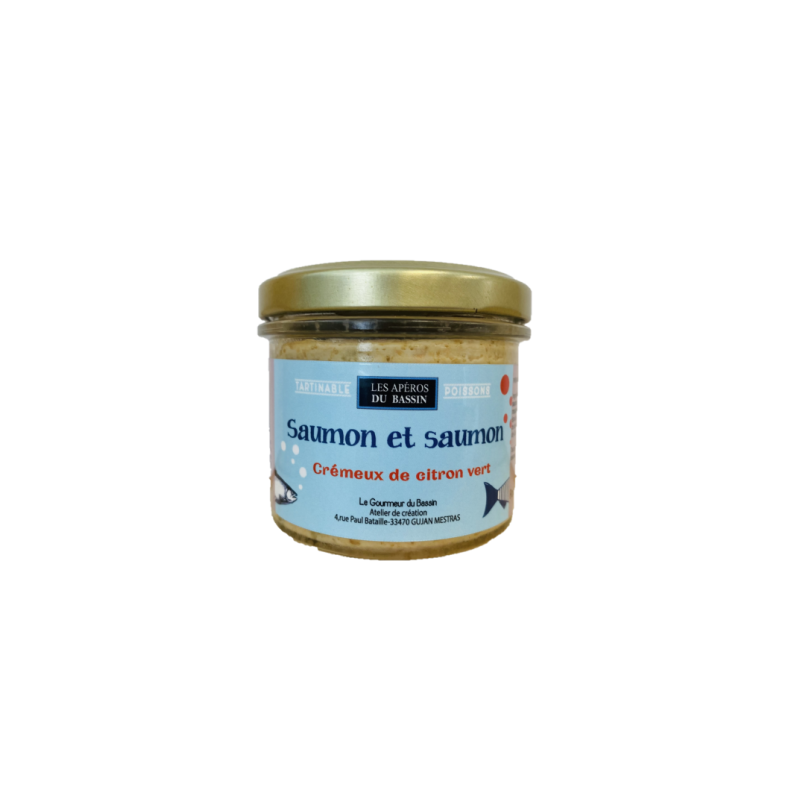 Ce tartinable Saumon et Saumon, en pot de 100 g, marie la finesse du saumon à la fraîcheur du crémeux au citron vert.