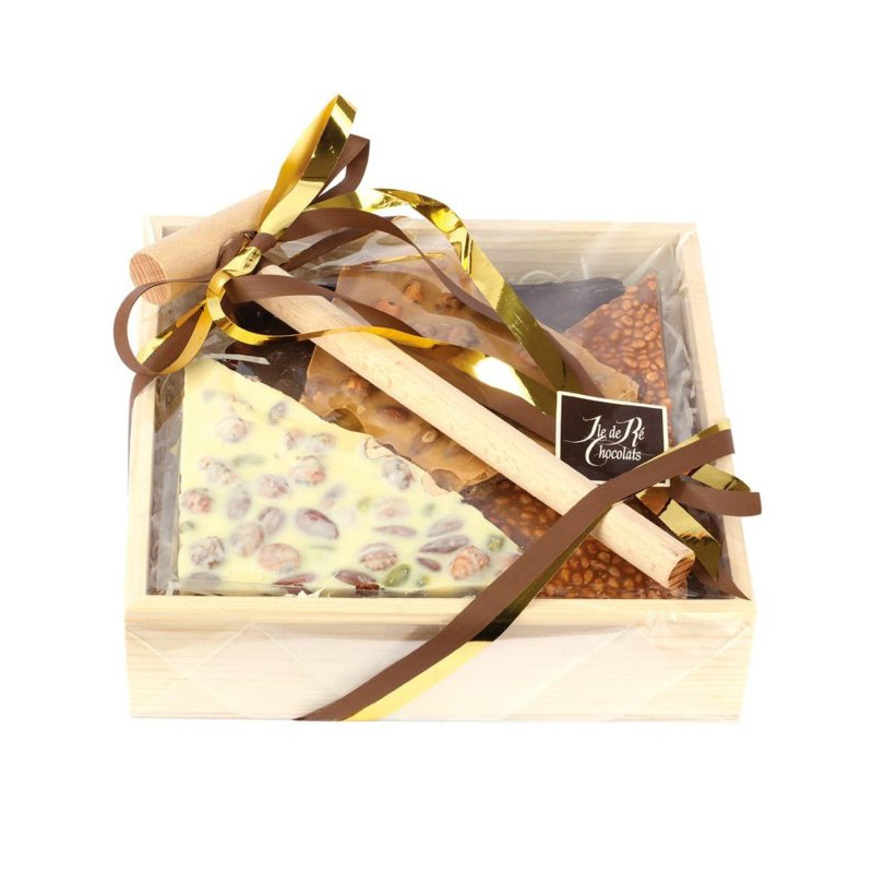 Boîte Marteau Plaques à Casser 600 g, chocolat gourmand blanc, noir, lait, blanc caramel et lait caramel, généreusement agrémenté d’amandes, noisettes, raisins secs, pistaches et céréales croustillantes.