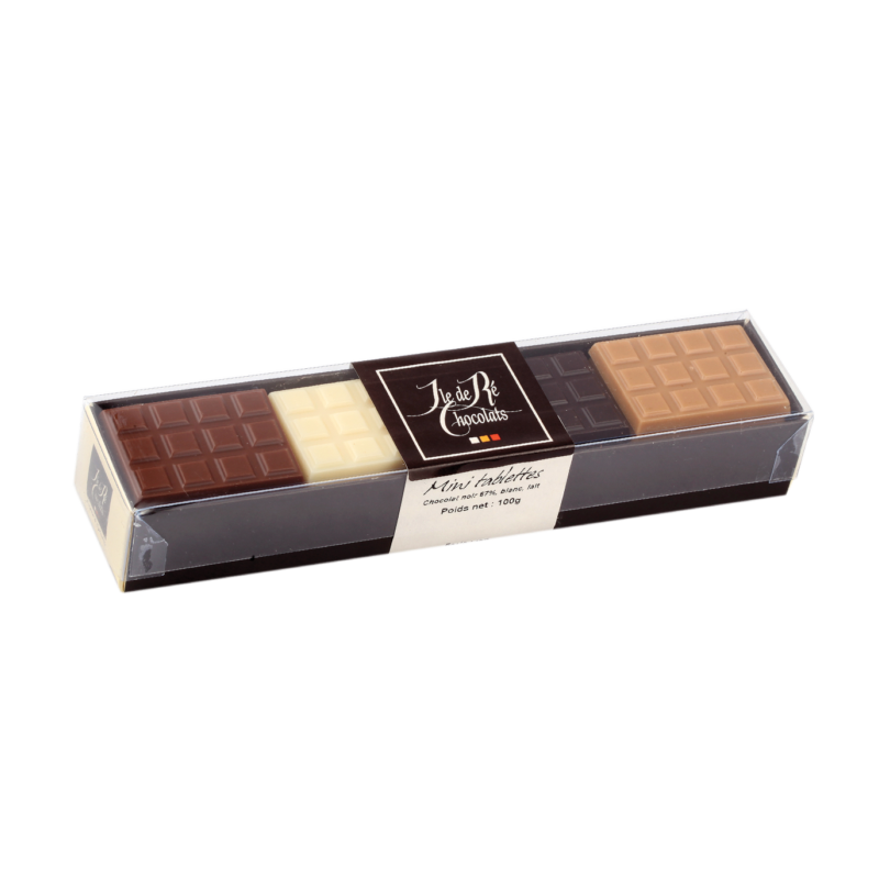 Assortiment de 20 mini tablettes 100 g Île de Ré Chocolats, chocolat noir, lait, blanc et blanc caramel, coffret gourmand artisanal parfait à offrir ou partager.
