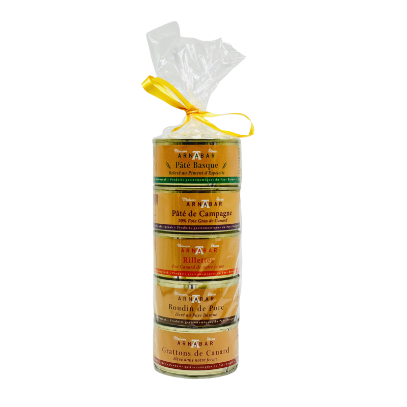 Le Ballotin de Charcuterie Arnabar propose une sélection de charcuteries artisanales typiques du Sud-Ouest. Il comprend le pâté basque au piment d'Espelette, le pâté au foie gras, les rillettes pur canard Arnabar, le boudin de porc et les grattons de canard, offrant un parfait équilibre entre saveurs relevées et tradition. Ce coffret est idéal pour découvrir ou offrir le meilleur des produits régionaux, prêt à partager lors d’un apéritif ou d’un moment gourmet.
