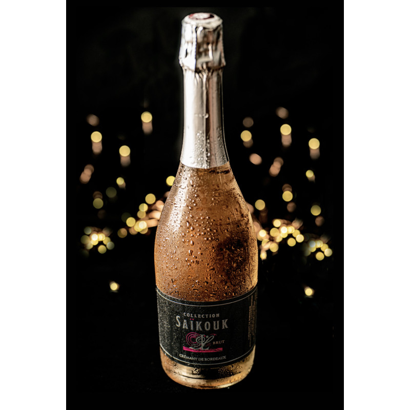 Crémant de Bordeaux Rosé Brut Collection Saïkouk, assemblage 50 % Merlot et 50 % Cabernet Franc. Frais, rafraîchissant et élégant, idéal à l’apéritif ou sur fruits de mer, bouteille de 70 cl.