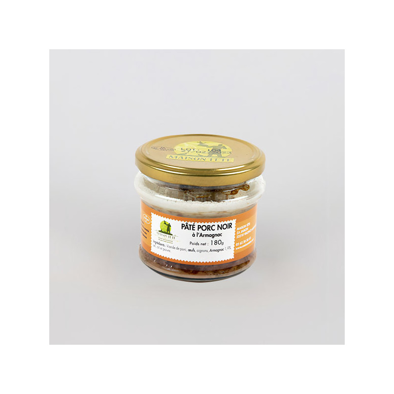 Pâté de porc noir à l’Armagnac en pot de 180 g, recette de caractère à la texture fondante et au goût typé, idéale pour les amateurs de charcuterie authentique.
