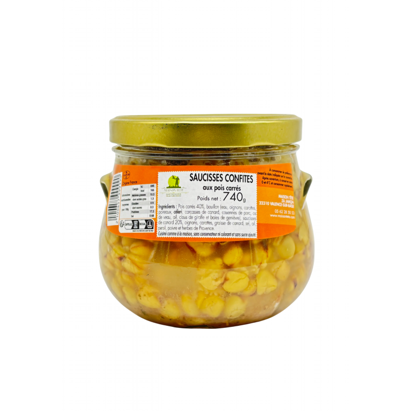 Composition: Pois carrés bio 40%, bouillon (eau, oignons, carottes, poireaux, céleri, carcasses de canard, couennes de porc, os de veau, ail, clous de girofle et baies de genièvre) saucisses de canard 20%, oignons, carottes, graisse de canard, sel, ail, persil, poivre et herbes de Provence.
