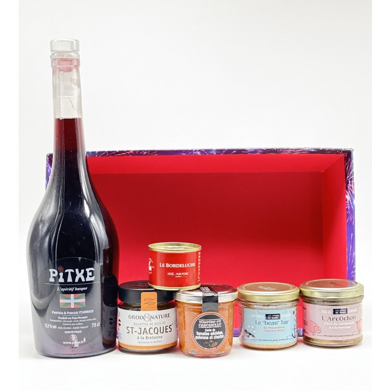 Le Coffret Plaisir est une invitation à la découverte des délices de nos régions. Il réunit des produits raffinés comme le Pitxe, idéale pour accompagner les moments festifs, les rillettes de noix de Saint-Jacques à la bretonne, ainsi que des spécialités artisanales du Sud-Ouest telles que L’Arcochon ou Le Bordeluche.