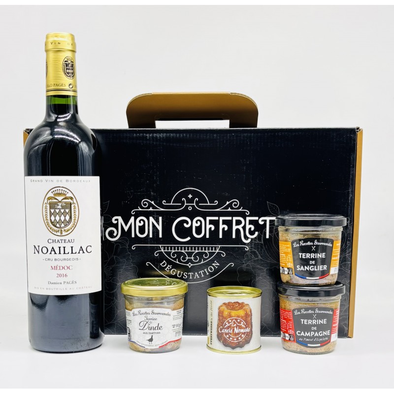 Le Château Noaillac 2016 accompagne parfaitement ces mets, et le canelé Nomade apporte la touche sucrée finale. Présenté dans une valisette cartonnée Mon coffret dégustation, ce coffret est idéal pour partager un moment gourmet ou offrir un cadeau raffiné.