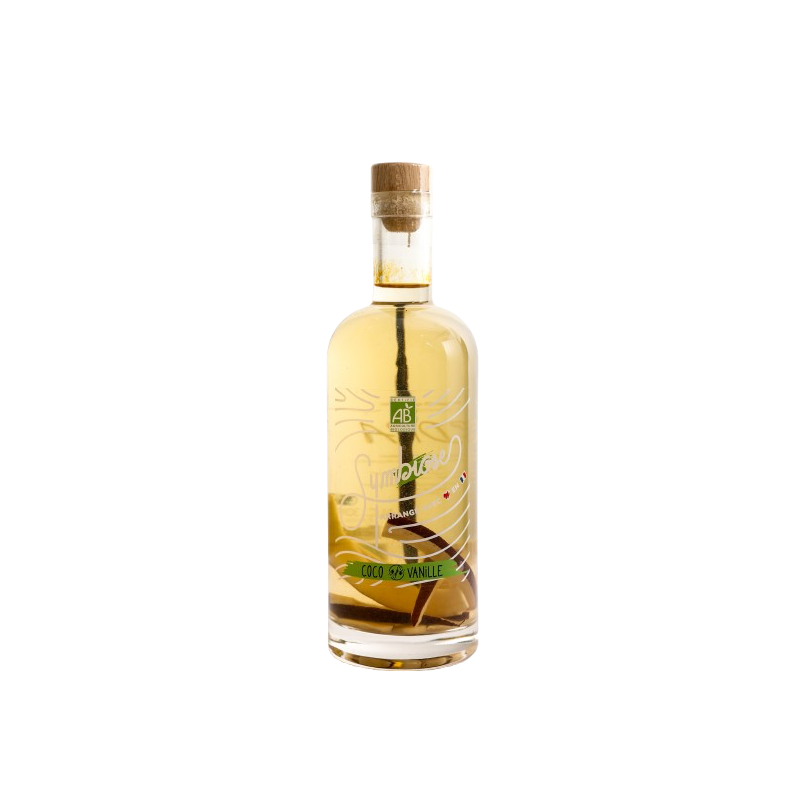 Rhum arrangé bio Vanille & Coco, doux et crémeux, idéal en apéritif ou digestif.