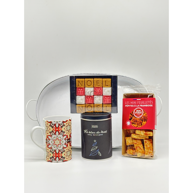 Un coffret chaleureux pour une pause détente autour d’un thé bleu de Noël, accompagné de douceurs et d’un joli mug.