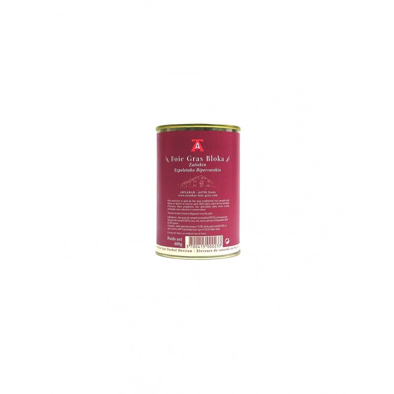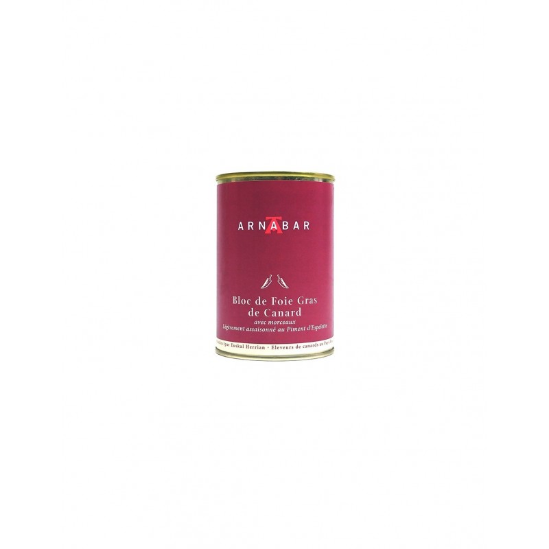Bloc de foie gras avec morceaux et piments d’Espelette Arnabar 580g, une spécialité basque subtilement relevée pour les amateurs de saveurs authentiques.